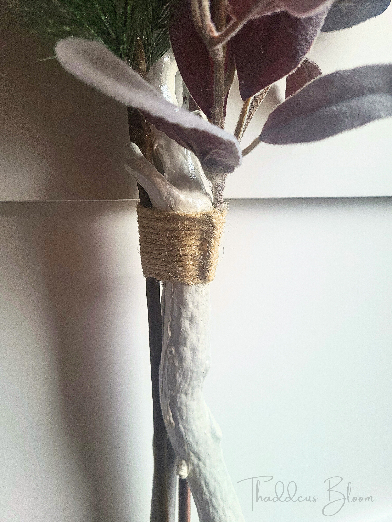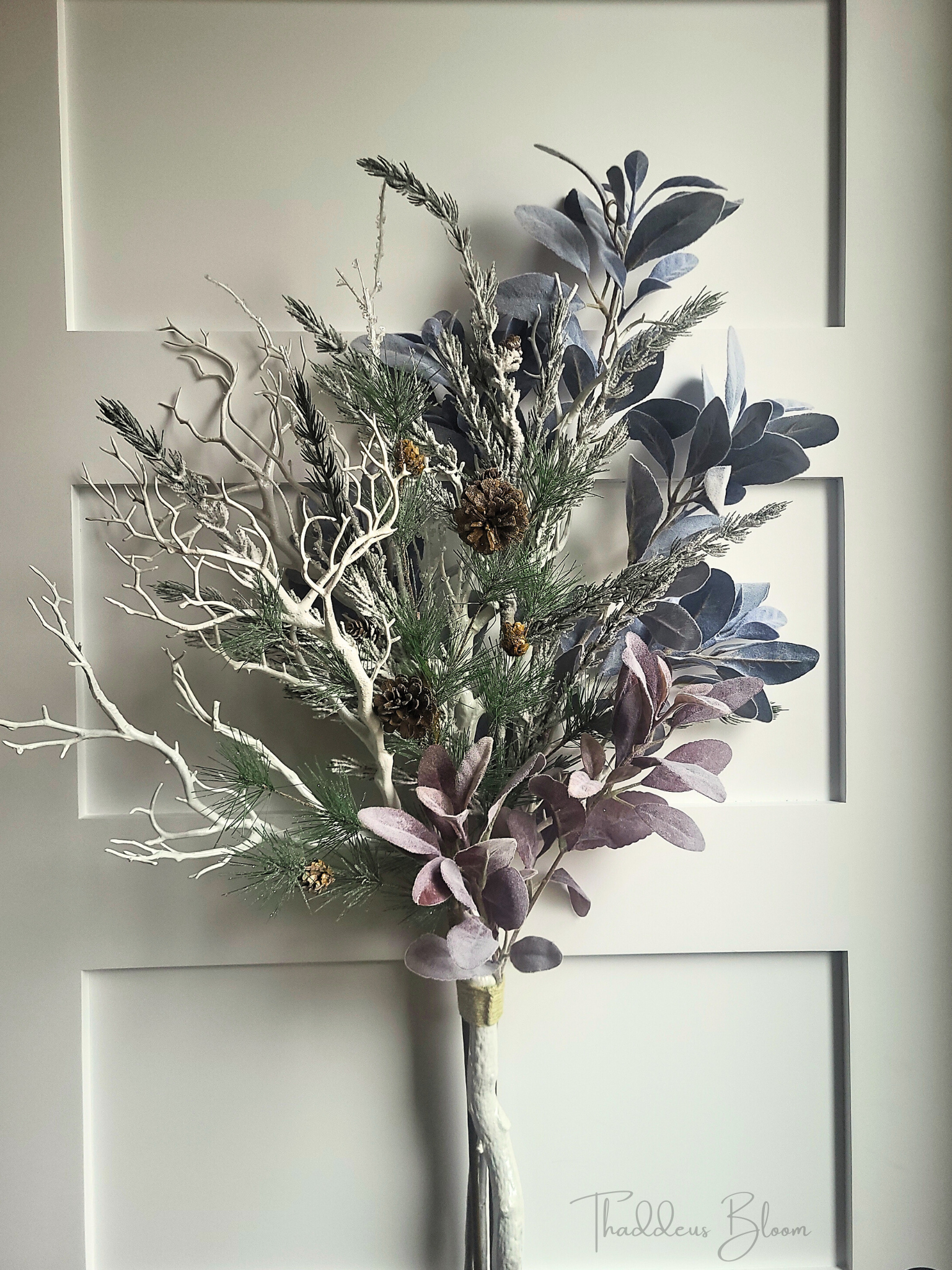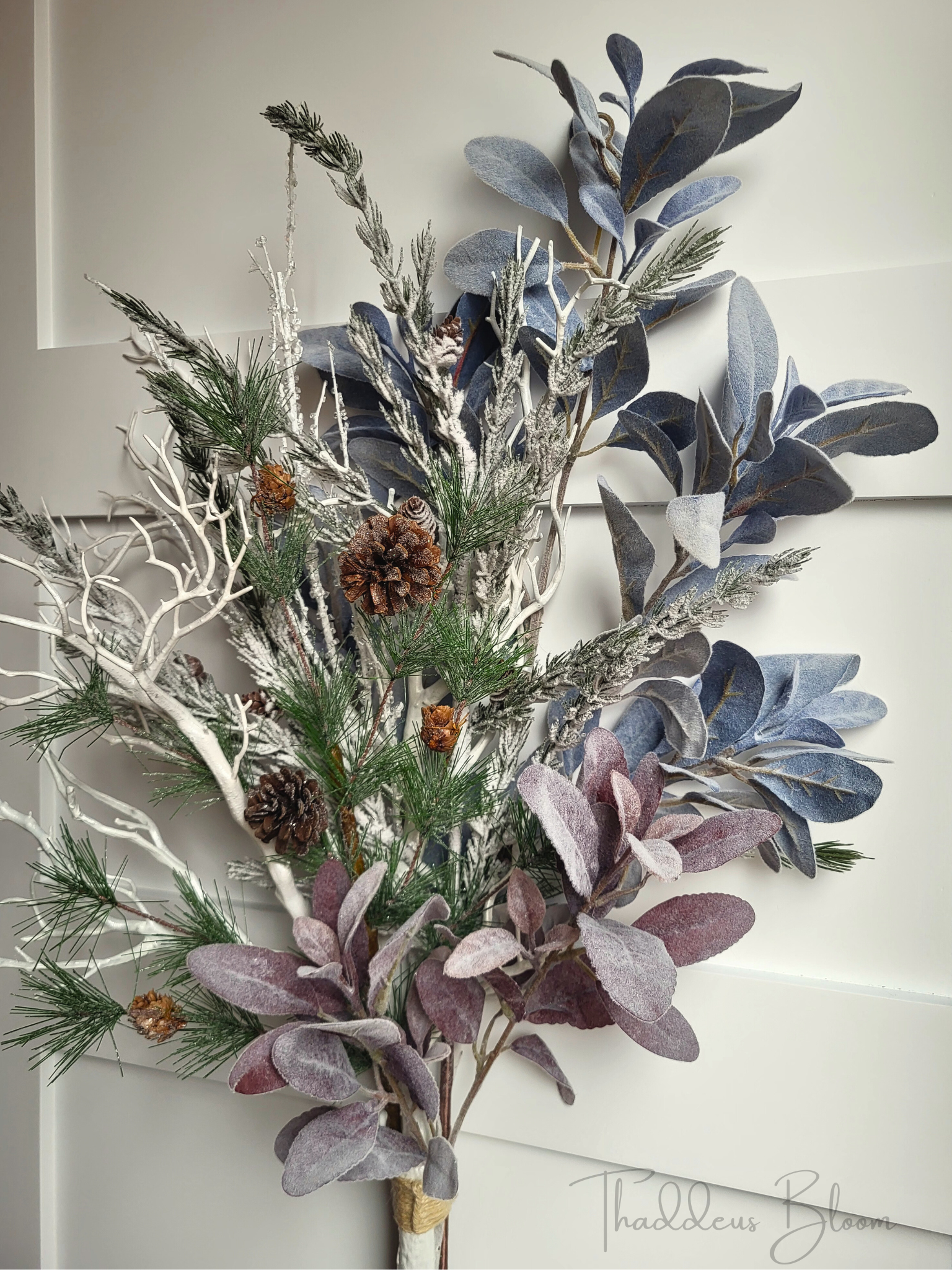 Lambs Ear, lightly flocked Cedar Branch, Pitch Pine with Pinecones sparingly sparkled in clear glitter for a shimmering frosted effect. The centerpiece of this bouquet is the contrast between the unique white pearlescent branch and the soft velvet real touch lambs ear. 'Velvet Snow' is a minimalists dream, with monochromatic tones of blues, greens, purples, giving this 3D wall art both edge and grace for any office, salon, spa or home décor for his or hers ideal space. Light cream beige jute twine wrapped about the stems completes this beautiful piece.